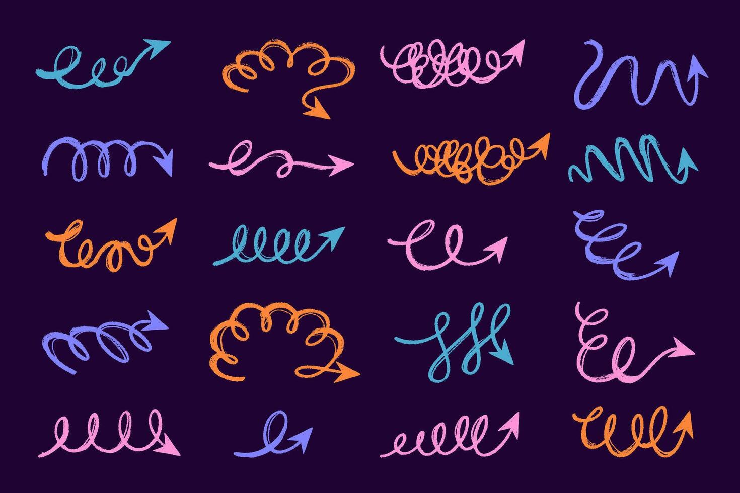 Retro Collection of Pencil Hand Drawn Squiggle Coils and Wavy Doodle Arrows. Scribbled arrow icons for infographics. Freehand sketches of thin spring arrows with loops with abstract curved lines. Pro Vector
