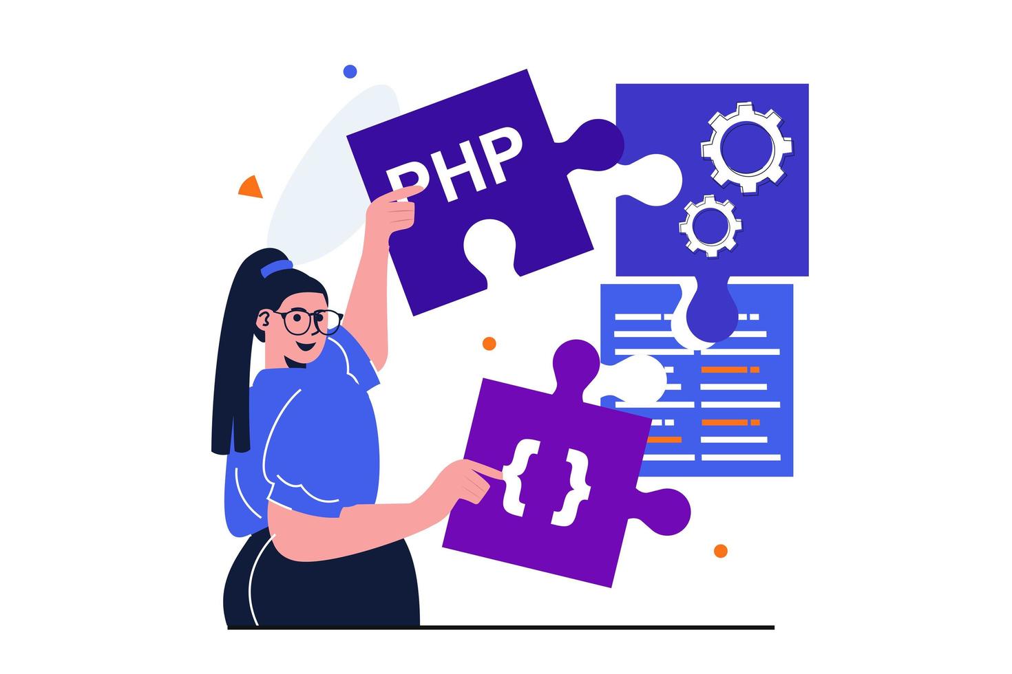 Programmer working modern flat concept for web banner design. Woman developer generates ideas and finds creative solutions, assembles project puzzles. Vector illustration with isolated people scene Pro Vector