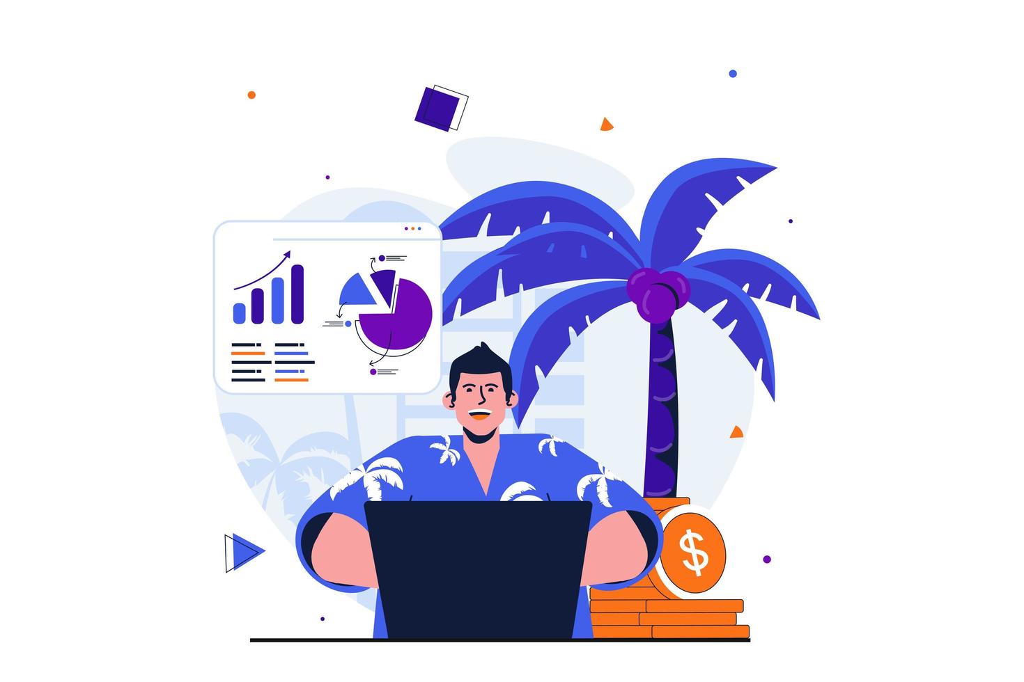 Freelance working modern flat concept for web banner design. Manager analyzes data and statistics from laptop while working online from tropical island. Vector illustration with isolated people scene