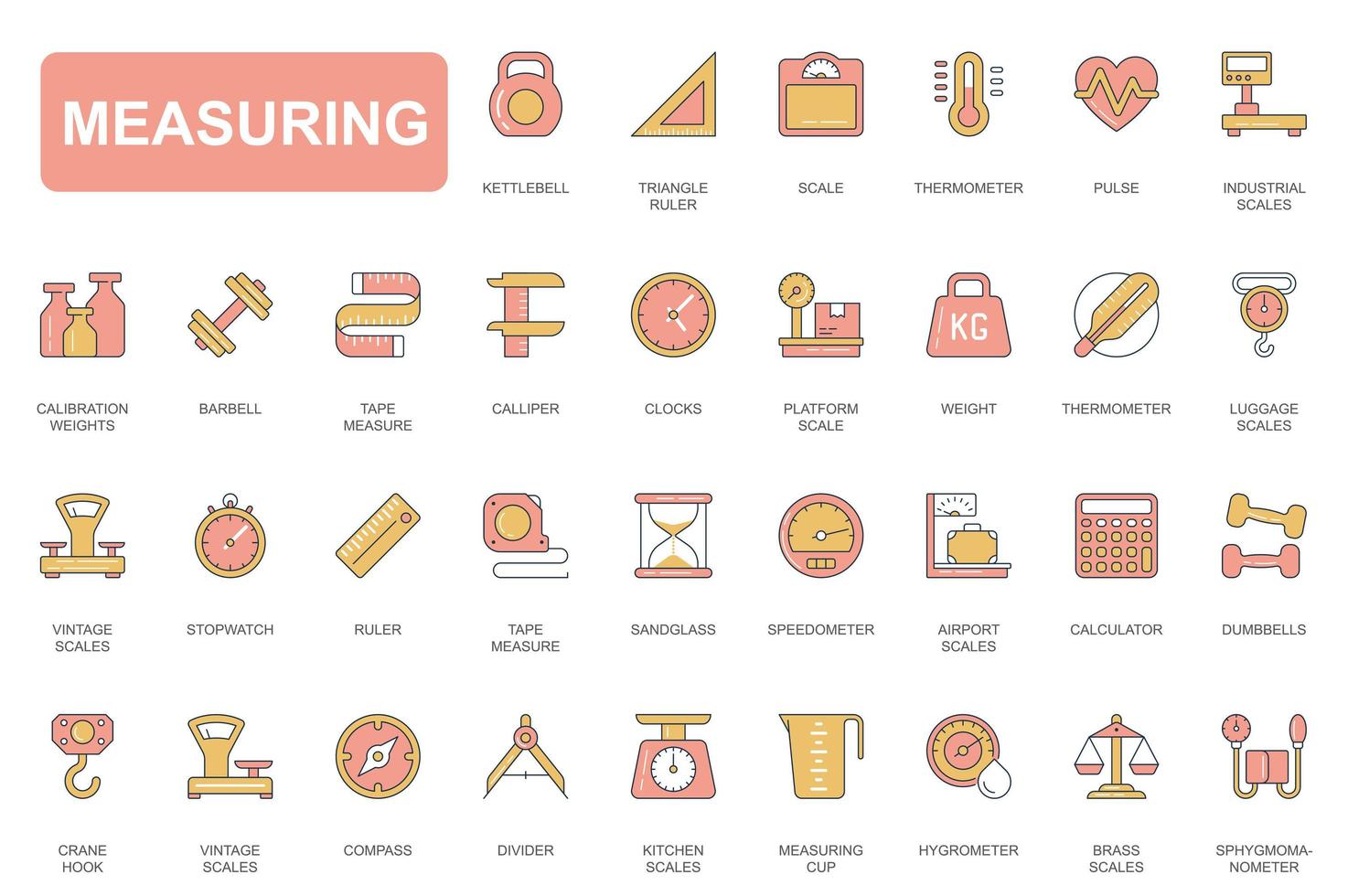 Measuring concept simple line icons set. Pack outline pictograms of kettlebell, ruler, scales, thermometer, clocks, sandglass, compass, divider and other. Vector elements for mobile app and web design Pro Vector