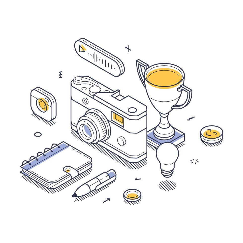 Creative tools and elements for content creation displayed in isometric line art style Pro Vector