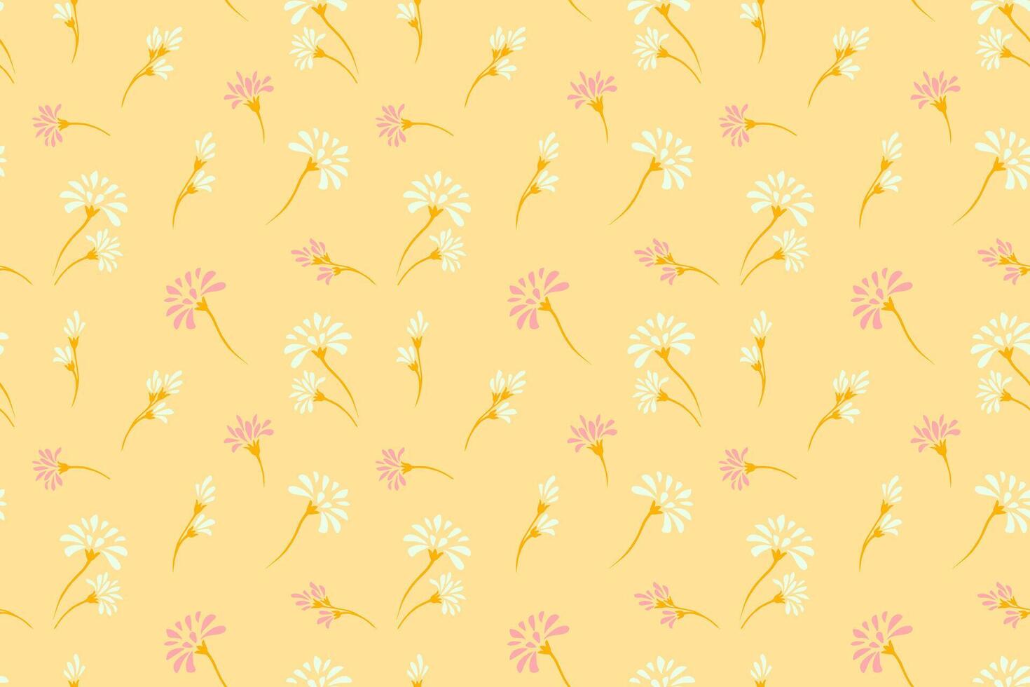 Seamless floral pattern with delicate daisies with stems on a soft yellow background. drawn plain unique flowers print. Design for spring summer themed projects, stationery, textiles Pro Vector