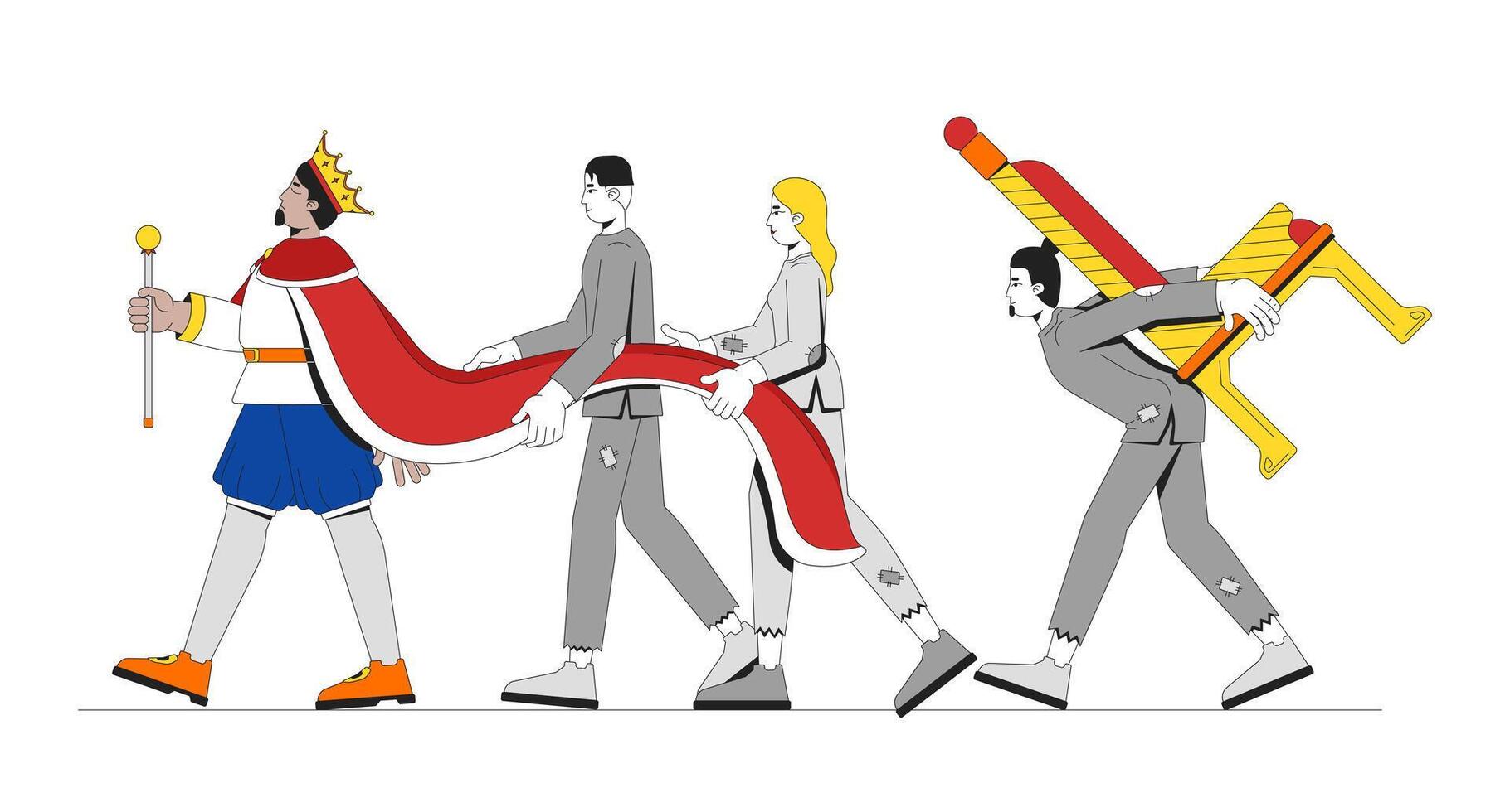 Burden of monarchy authority and class struggle 2D illustration concept. King walking ahead with impoverished servants exploitation cartoon characters isolated on white. Flat abstract graphic Pro Vector