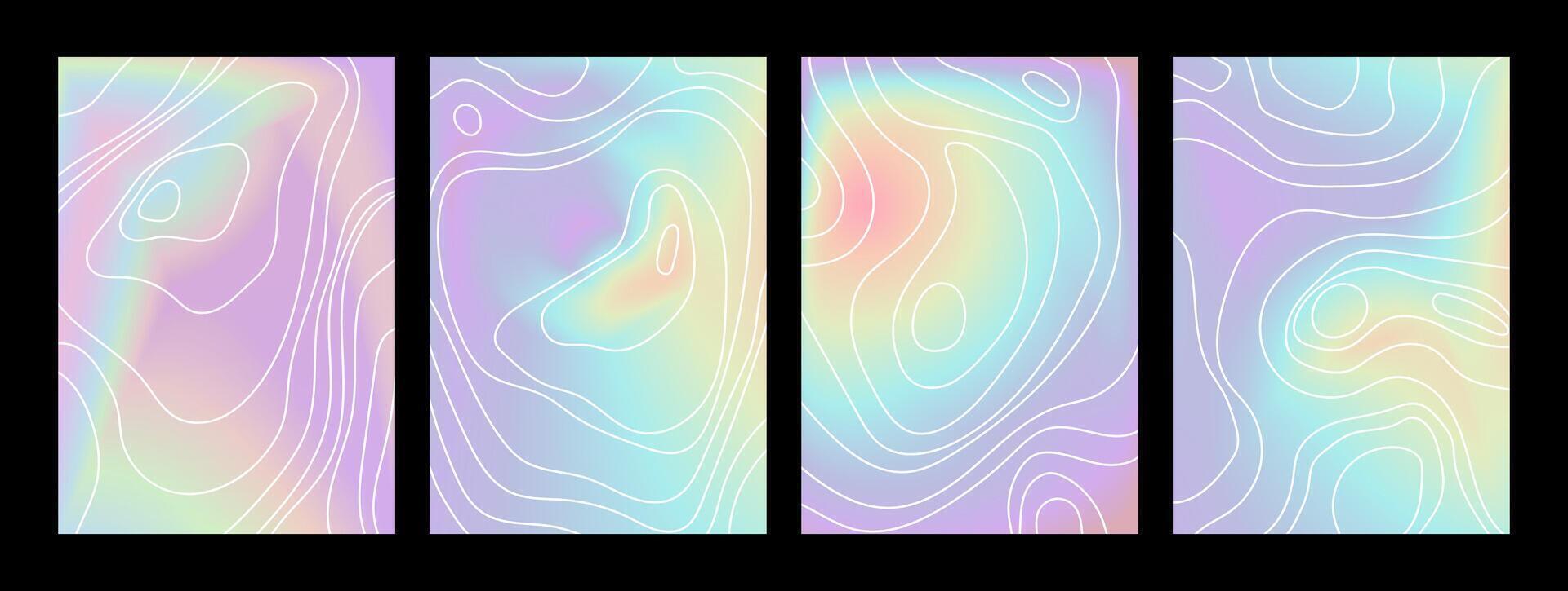 Abstract holographic gradient backgrounds set with white contour lines, creating a futuristic and modern topographic effect. Ideal for digital designs, social media,posters, branding projects. Pro Vector
