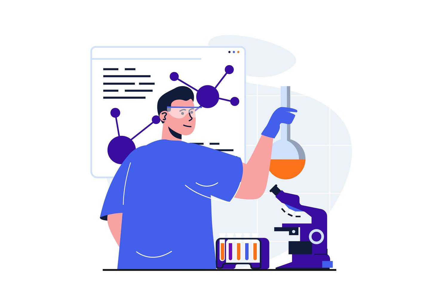 Science research modern flat concept for web banner design. Man scientist holds flask with studied liquid, makes test and analysis results in laboratory. Vector illustration with isolated people scene Pro Vector