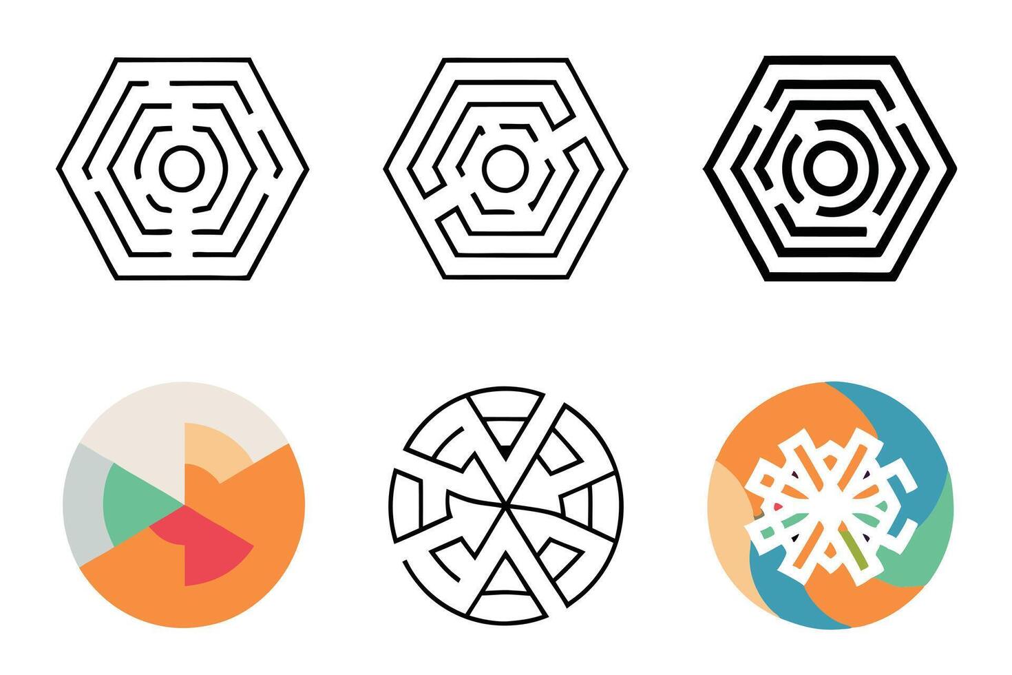 Abstract geometric icon set featuring interlocking hexagons on a white background, clean modern design ideal for various creative Pro Vector