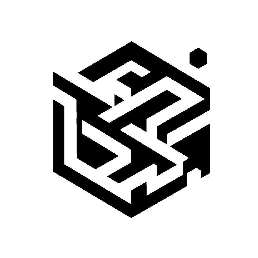 Abstract isometric cube with mazelike structure, contrasting black and white, featuring a small hexagonal element. vector