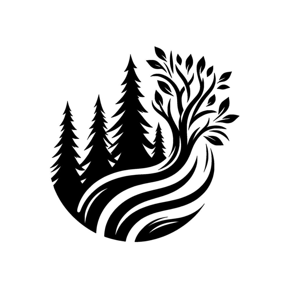 Stylized black and white of a forest scene with pine trees and a leafy tree entwined within a circular shape. Pro Vector