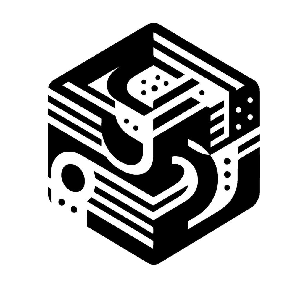 Isometric Abstract Cube Black White Geometric with Curves, Lines, and Dot Patterns on White Backdrop. vector