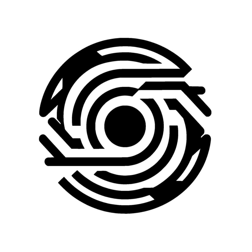 Abstract Black and White Circular Design A Labyrinthine Composition with Concentric Rings and Angular Extensions, Isolated on White. vector