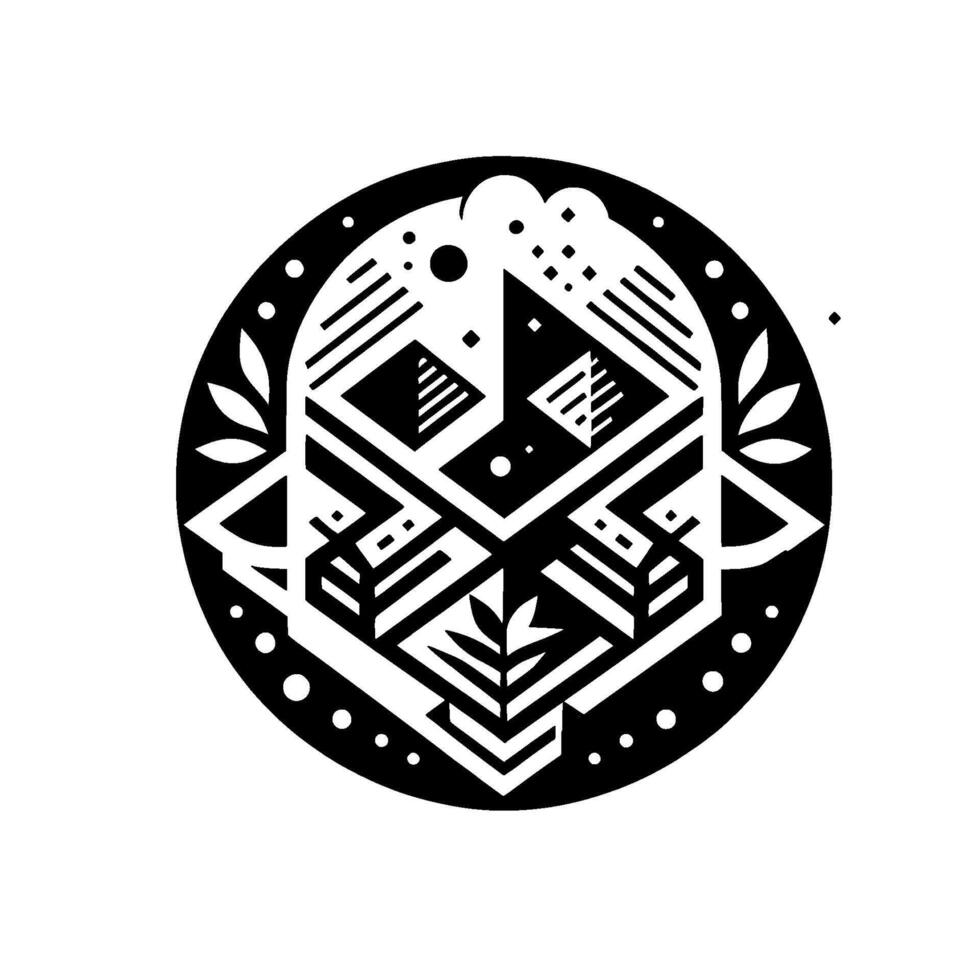 Geometric Black and White Emblem with Angular Shapes, Leaves, and Circular Frame, Minimalist Abstract Art. vector