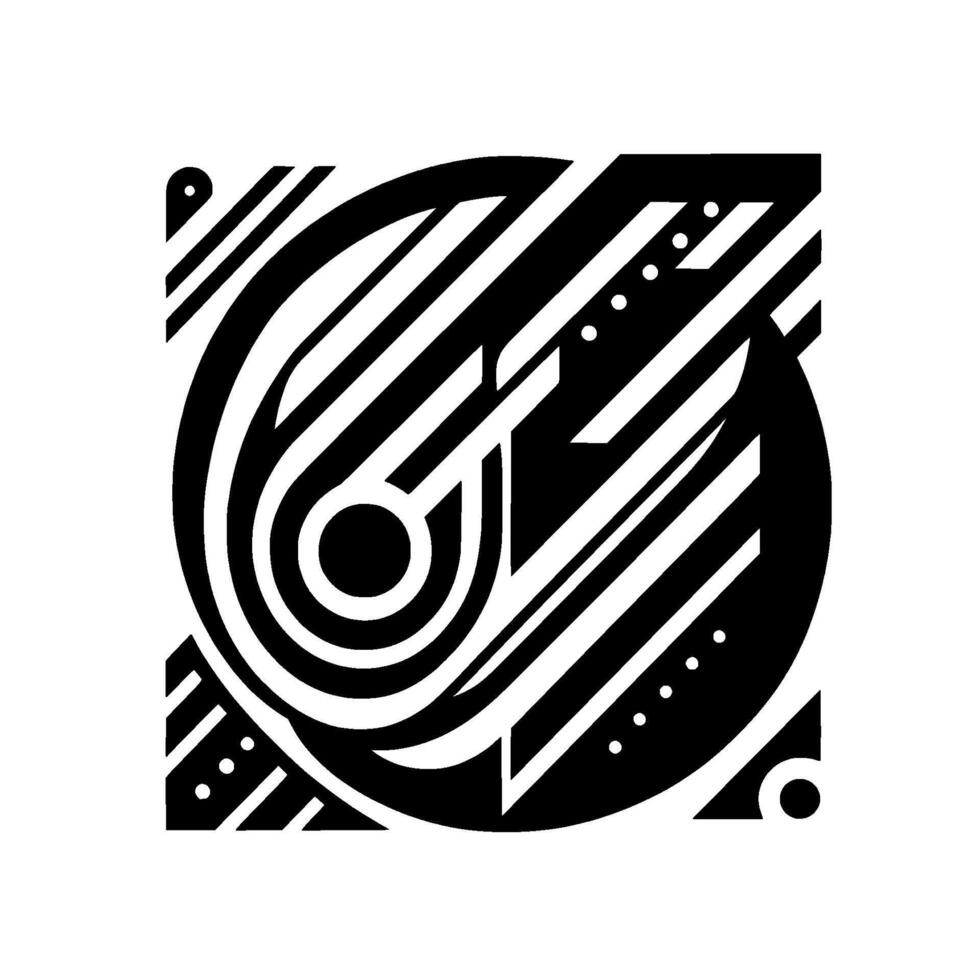 Bold Black and White Geometric Abstraction within Square, Featuring Circle with Concentric Lines, and Angular Forms. vector