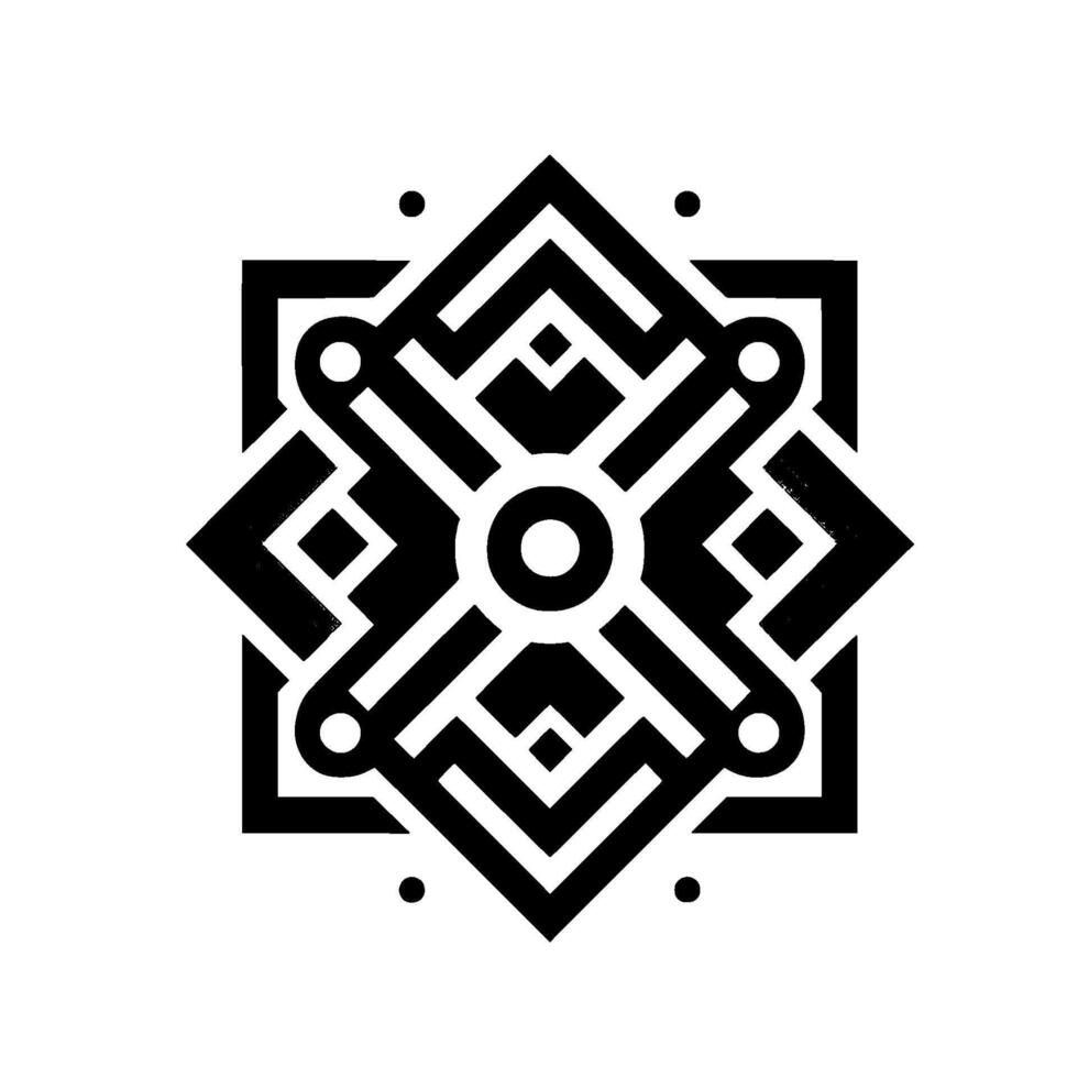 Symmetrical Black and White Geometric Starburst Mandala with Intricate Interlocking Shapes, Circles, and Square Elements vector
