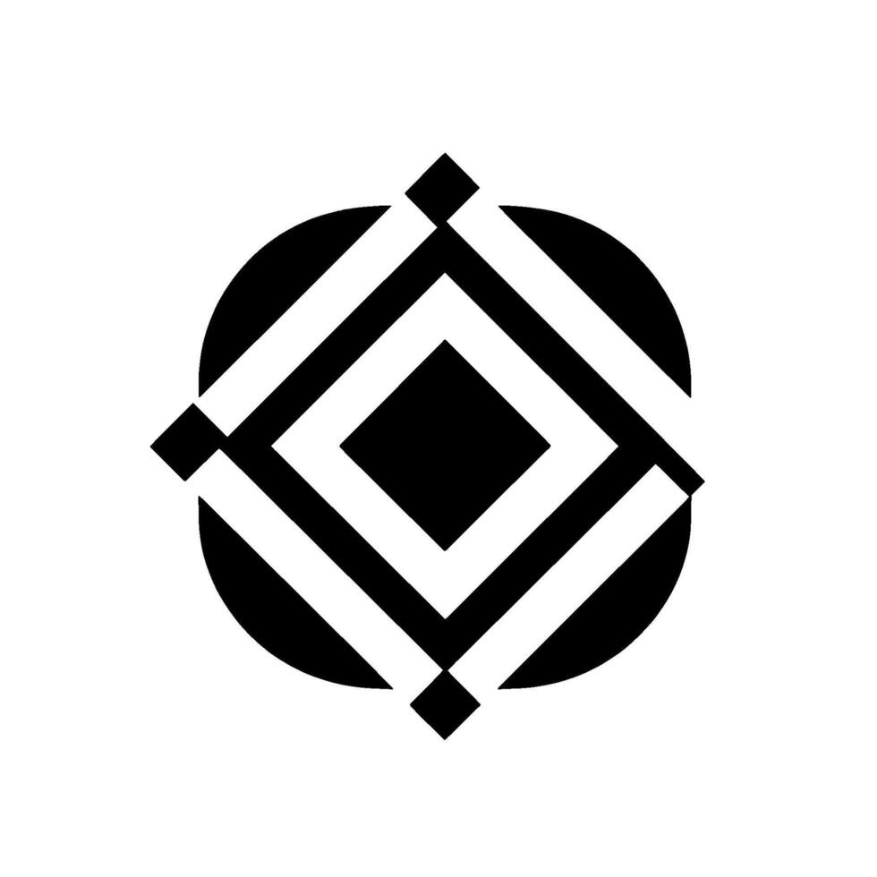 Geometric Composition A symmetrical abstract of overlapping black and white geometric shapes including diamonds, squares, and lines within a circular backdrop, minimalist style. vector