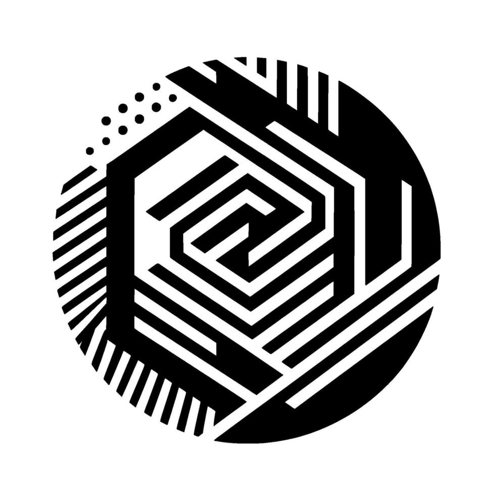 A geometric composition depicting a D hexagonal maze at the center, enclosed by a circular pattern of black and white lines, dots, and shapes. vector