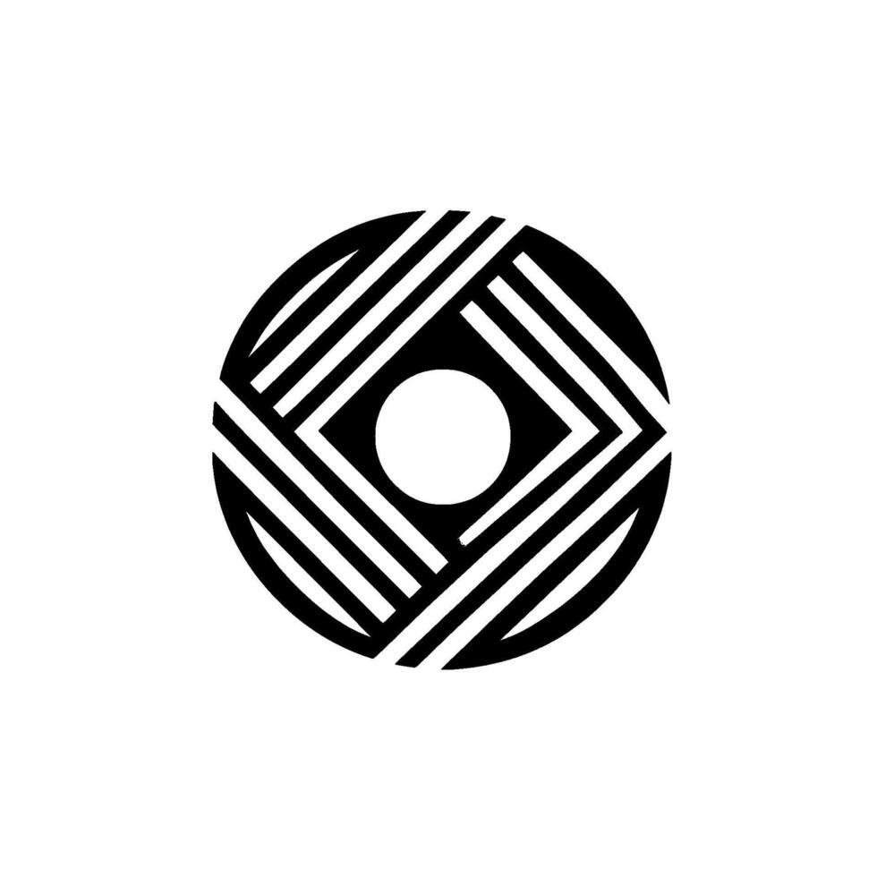 Abstract geometric of a black and white circular composition featuring a square within a circle, with diagonal stripe patterns, and a central white dot. vector