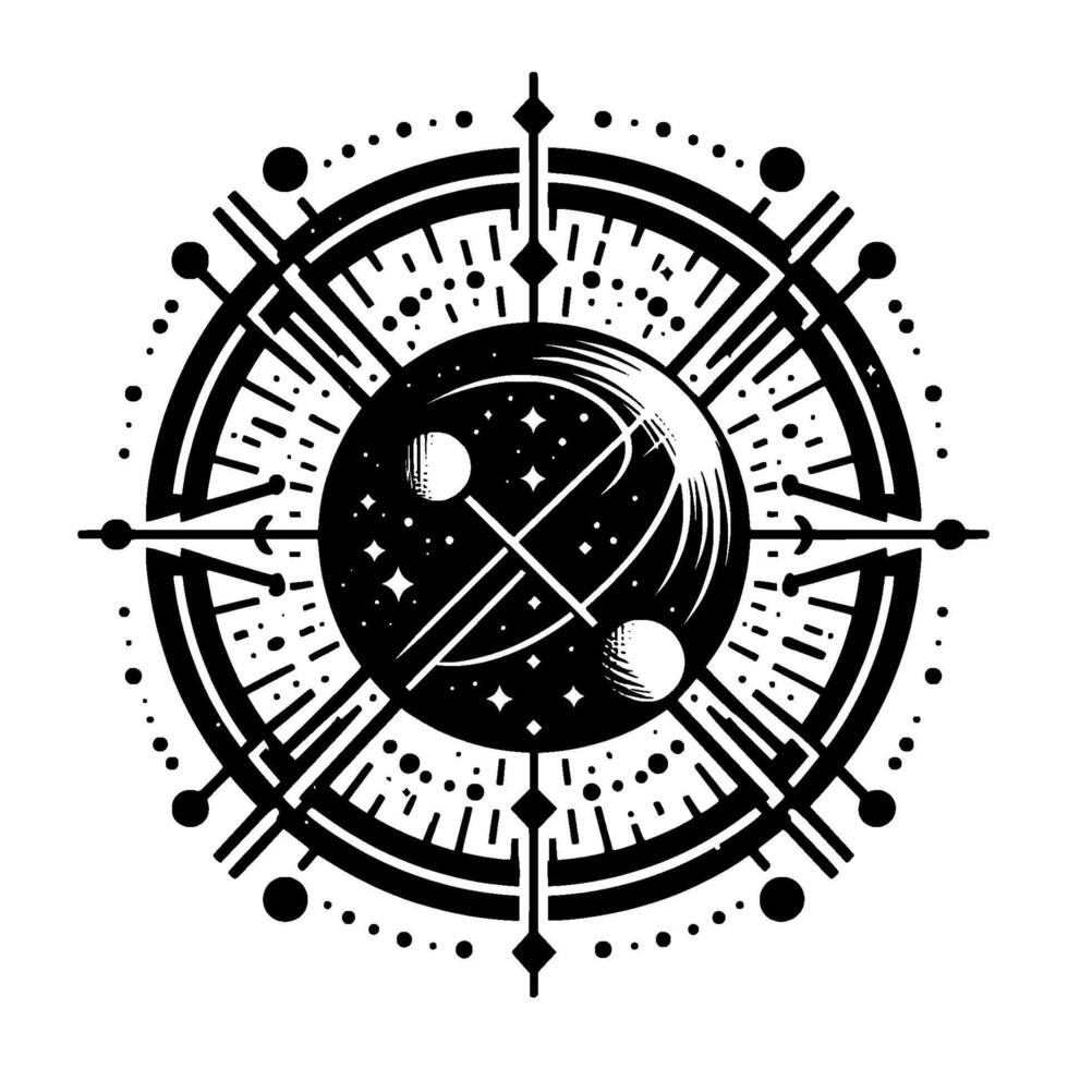 Celestial Compass A symmetrical black and white featuring a stylized planet, orbit lines, stars, and concentric circular geometric patterns resembling a cosmic guide. vector