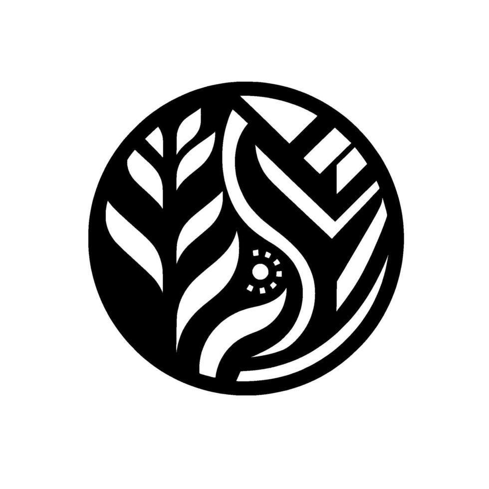 Abstract Monochrome Circular featuring stylized foliage, geometric patterns, and a sunburst element, set against a white background. vector