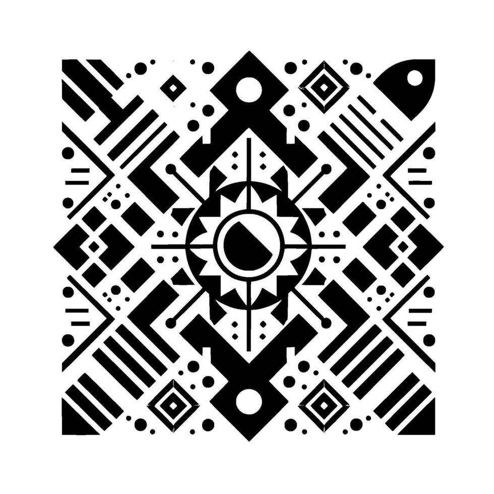 Geometric, symmetrical, black and white abstract art with sunlike center, radial and sharp lines, minimalistic style vector