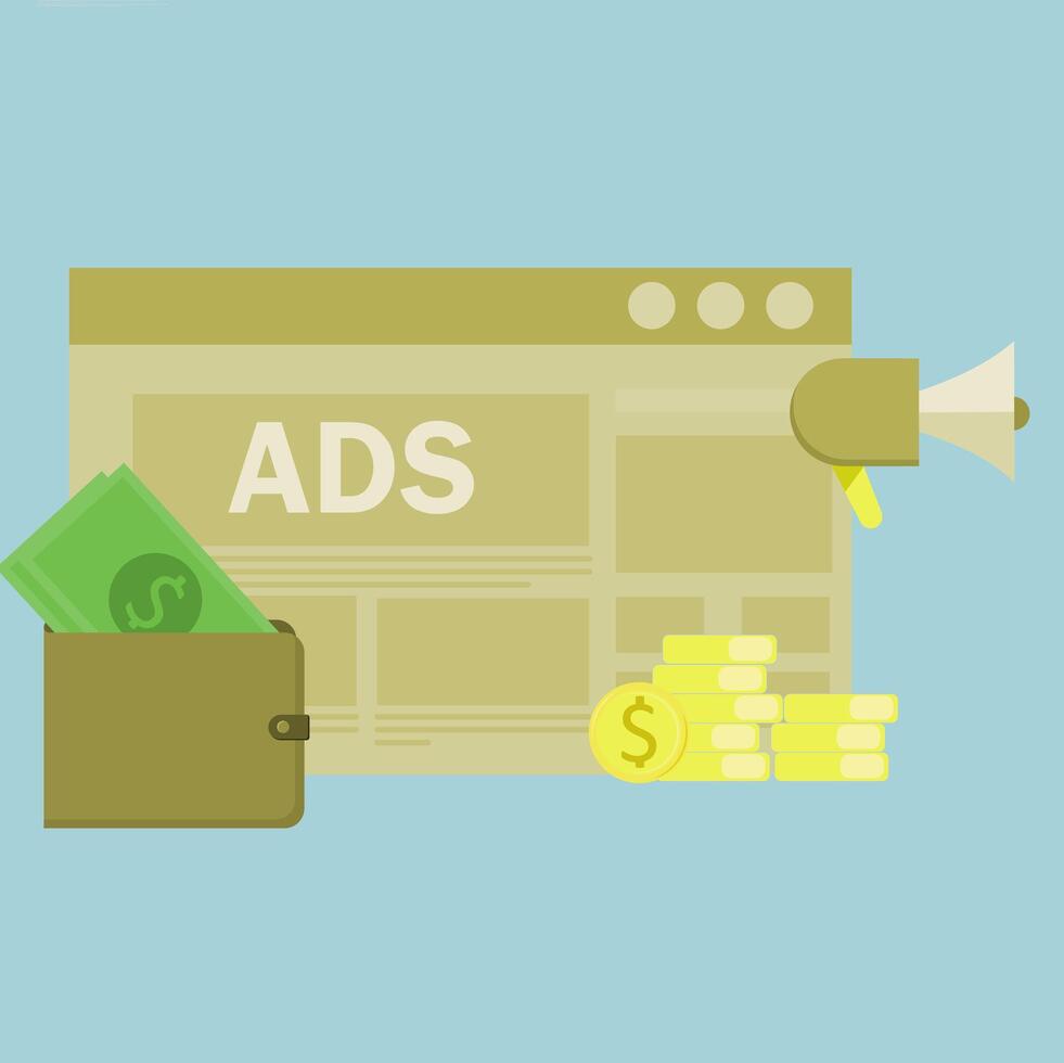 Ad Revenue - increase and optimize online pay per click advertising revenue. Illustration of a browser with website banner ads generating cash revenue. Pro Vector