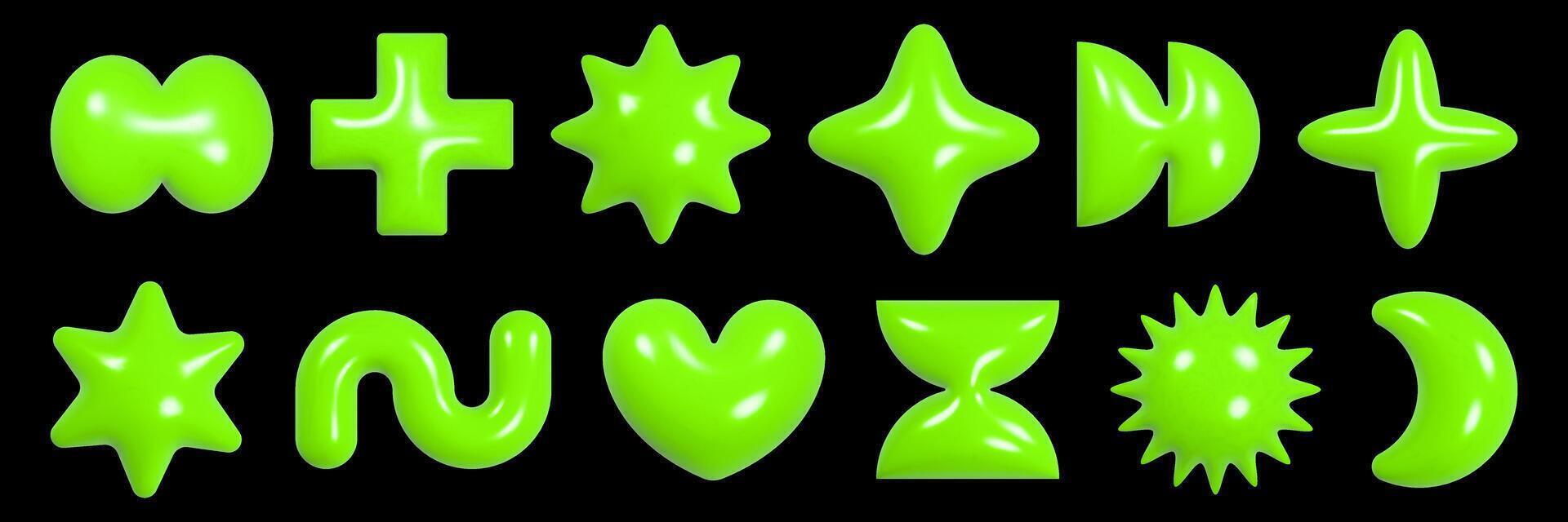 Exploring a vibrant collection of geometric 3D figures with a shiny plastic texture in a y2k aesthetic. Pro Vector