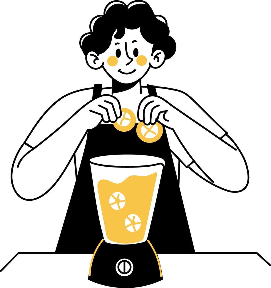 Smiling character making juice in blender, doodle illustration Pro Vector