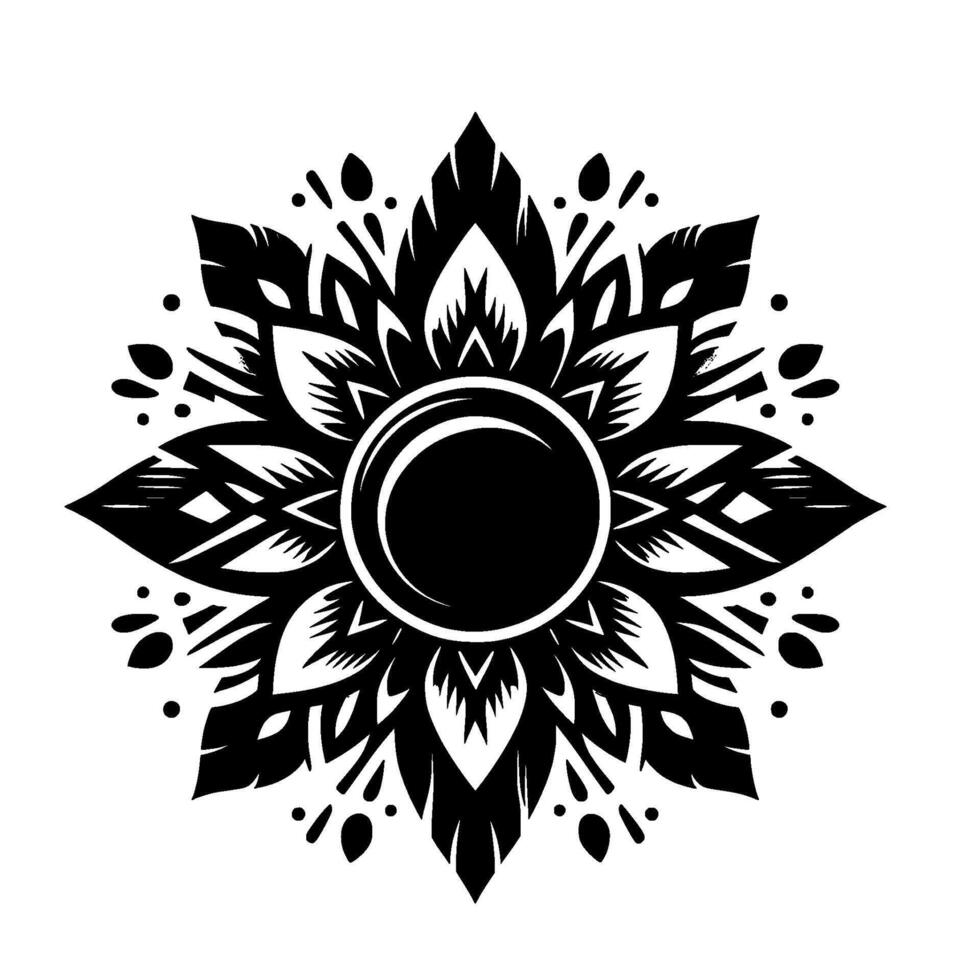 Bold Black and White Floral Mandala with Central Circular Element, Detailed Geometric Patterns and Sharp, Symmetric Composition. vector