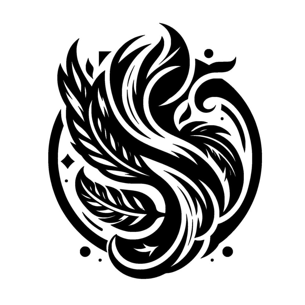 A symmetrical black and white featuring stylized featherlike elements and organic curves contained within a circle, creating a balanced aesthetic. Pro Vector