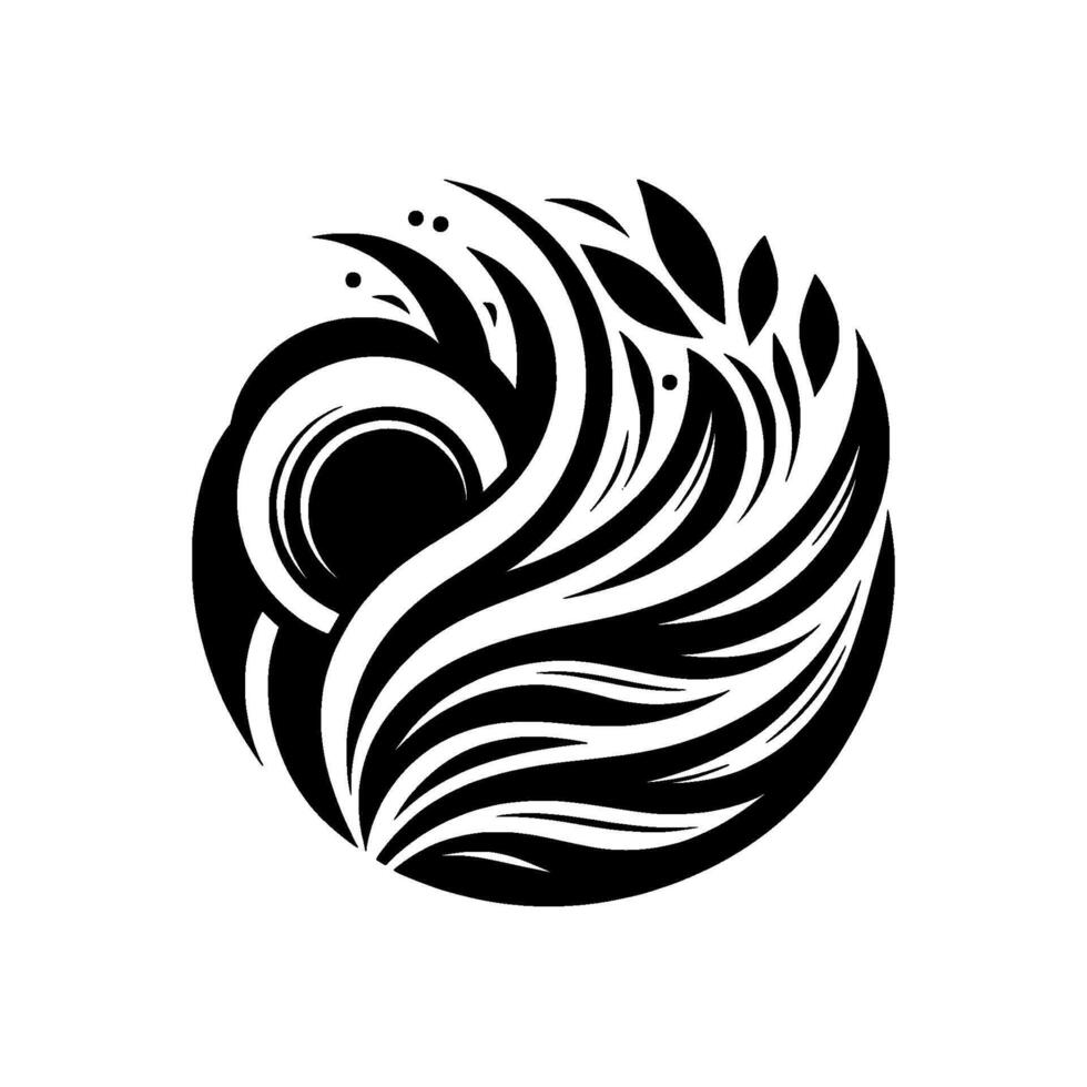 A stylized, blackandwhite, circular illustration of a dynamic, flowing pattern with curved lines, arcs, and leaflike elements, evoking a sense of balance and natural form. Pro Vector