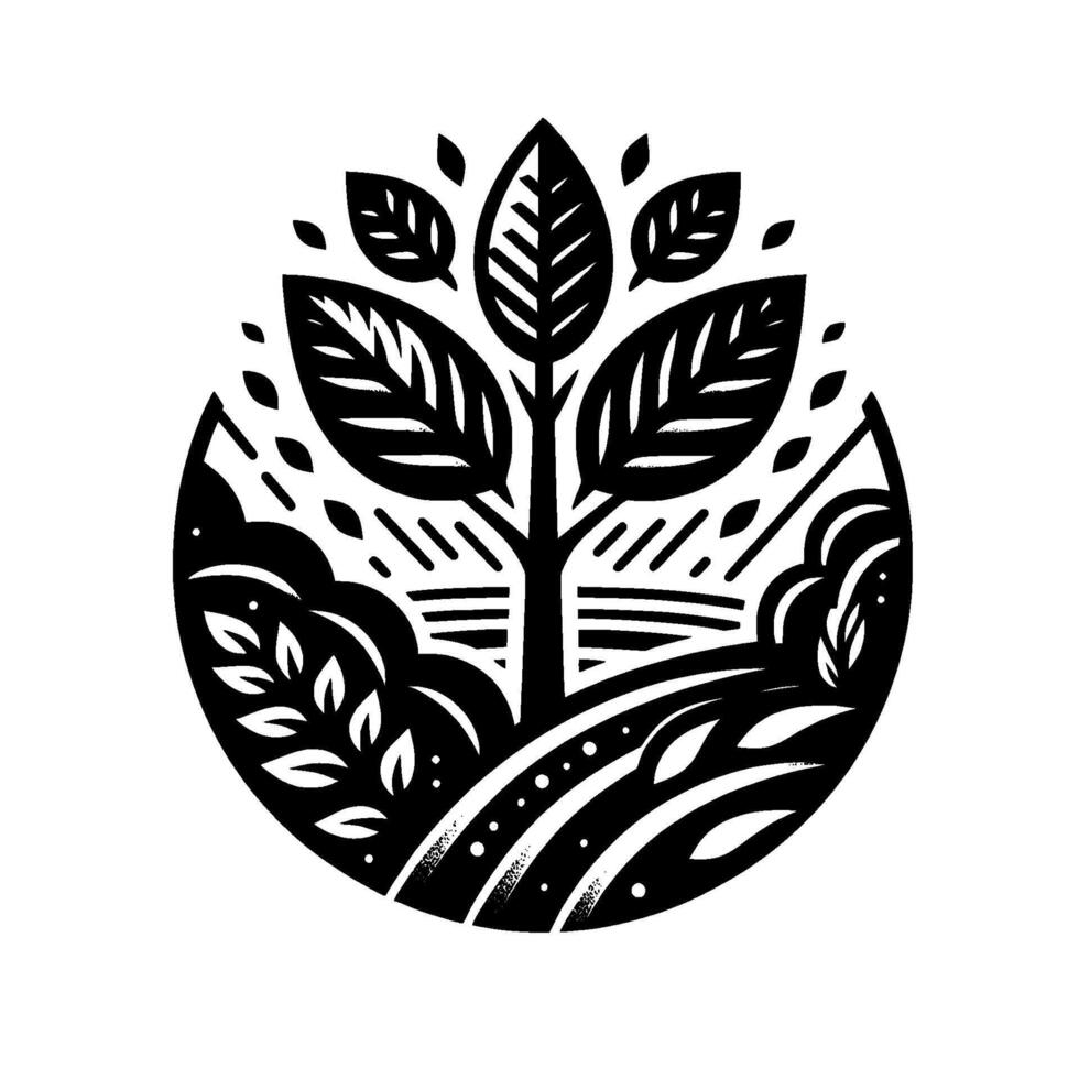 Black and white circular nature emblem, illustrating a tree with large leaves, surrounded by stylized fields and foliage, representing growth and environment. Pro Vector
