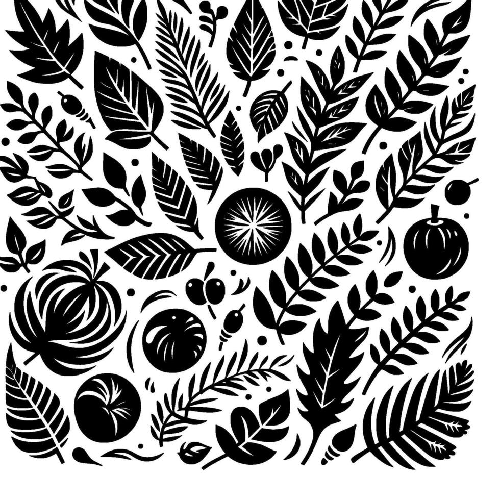 A monochrome botanical featuring diverse leaves, berries, and stylized fruits creating a repeating pattern on a white backdrop. Free Vector