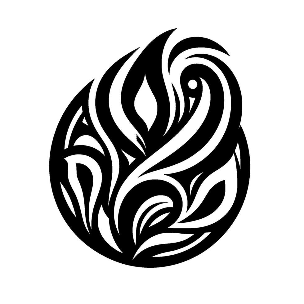 A symmetrical, stylized black and white teardropshaped abstract featuring swirling lines, leaflike forms, and geometric patterns, set against a stark white background. vector