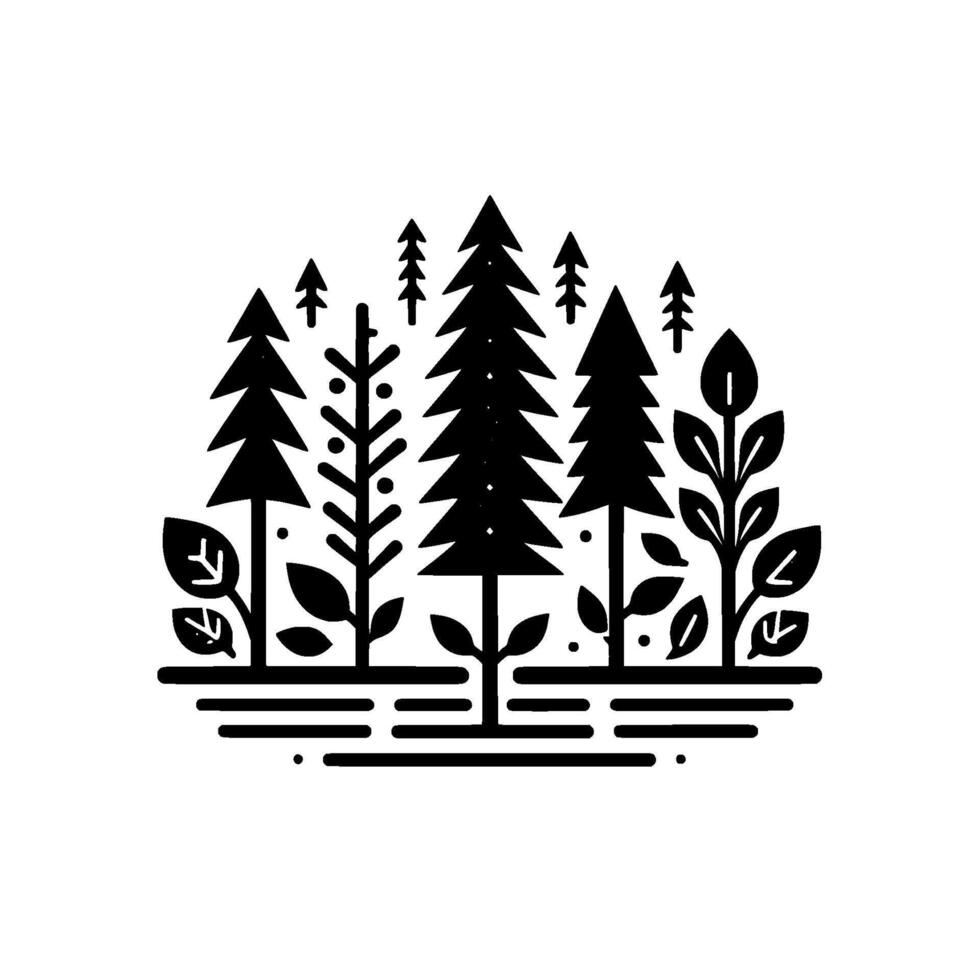 Black and white stylized illustration of a miniature forest with various trees, plants, and leaves, set on a simple base of horizontal lines. vector
