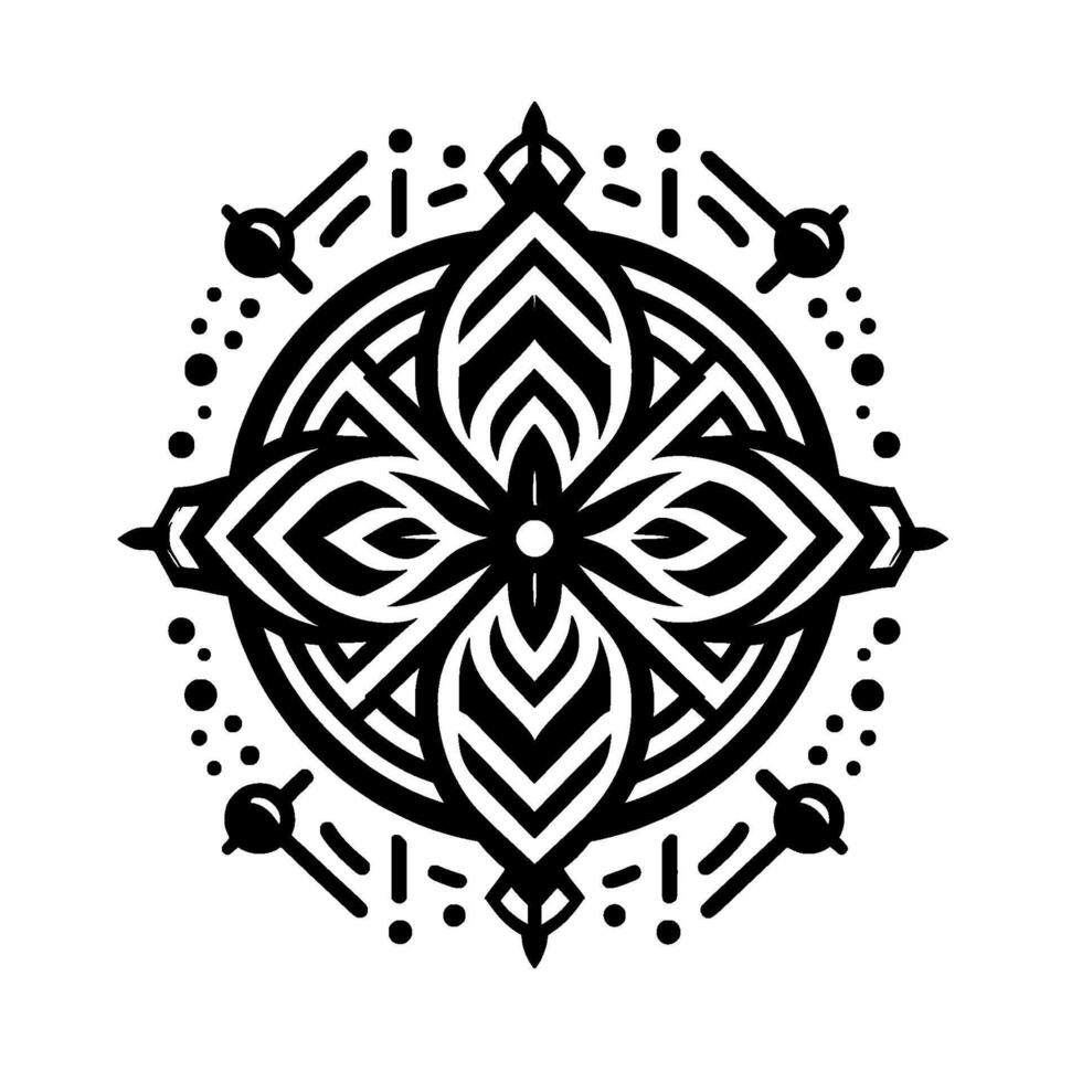 A symmetrical black and white floral mandala featuring intricate petal patterns, surrounded by a circular border with dotted and line elements, on a clean white background. vector