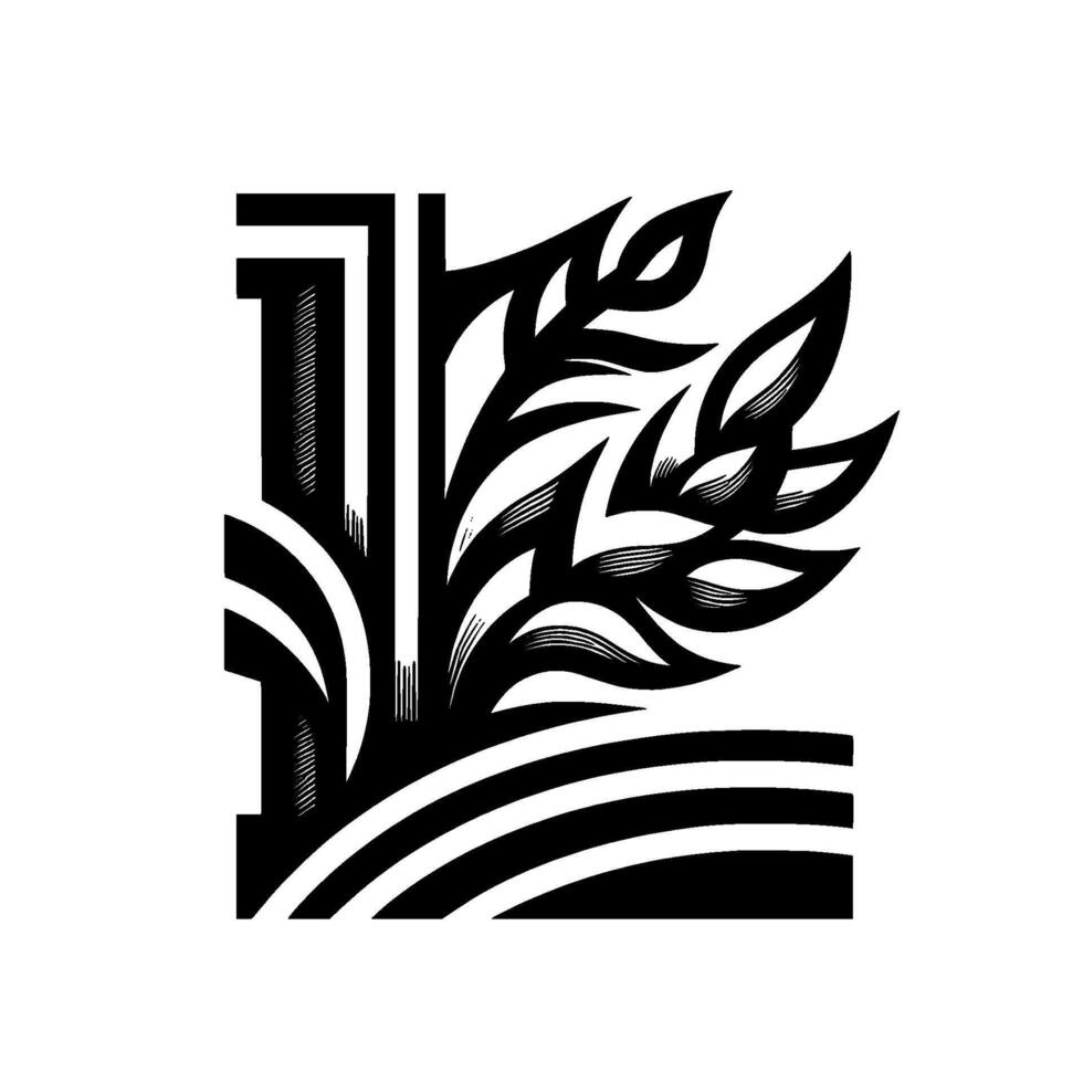 Black and white stylized wheat stalk and stem with horizontal lines, angular elements, and a minimalist geometric structure. Pro Vector