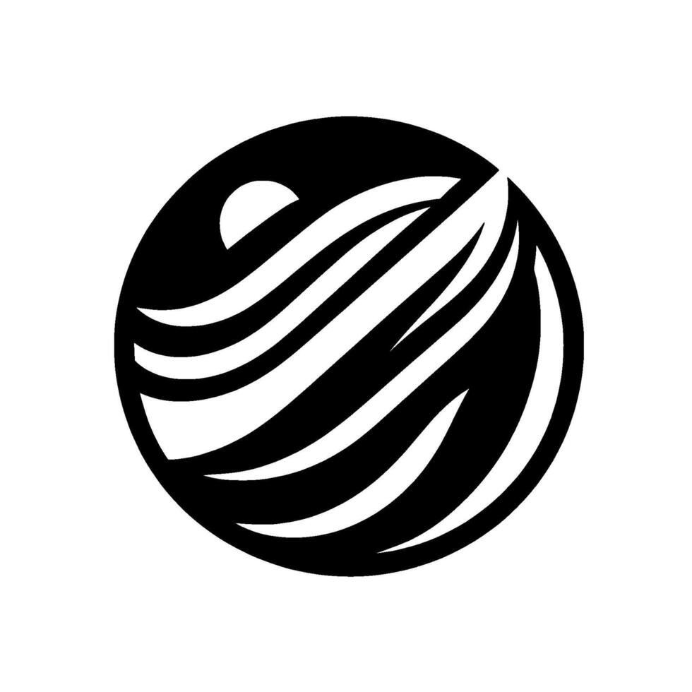 Abstract, minimal black and white of stylized waves, sun, and ocean horizon, contained within a circular frame, offering a sense of tranquility. Pro Vector