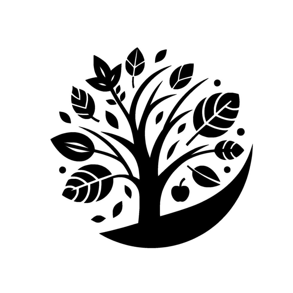 Stylized Black and White of a Tree with Leaves and Apple, on a White Background in a Circular Composition Pro Vector