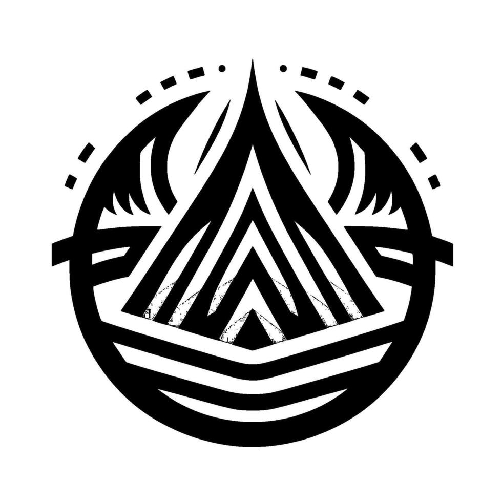 Geometric Tribalinspired black and white featuring a central triangle within a circular frame, with sharp angles and stylized details, suggesting a symbol or emblem. Pro Vector