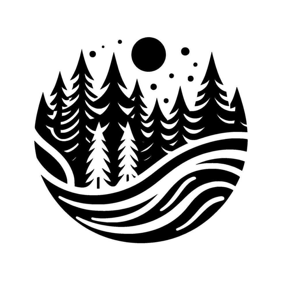 Monochromatic Forest Scene in Circular Frame Featuring Evergreens, Moon, and River with Organic Style. vector