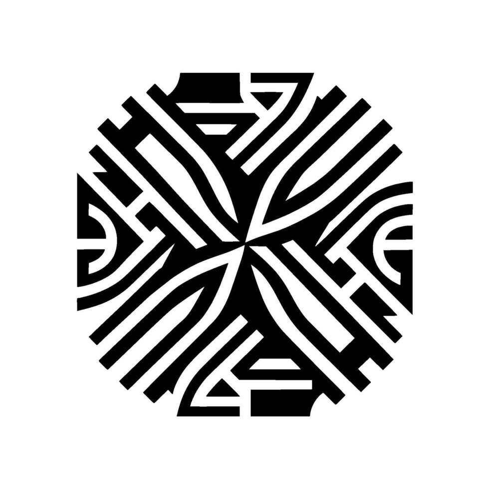 Intricate Black and White Geometric Mandala Composed of Interlocking Abstract Shapes and Linear Elements, Creating Radial Symmetry. Pro Vector
