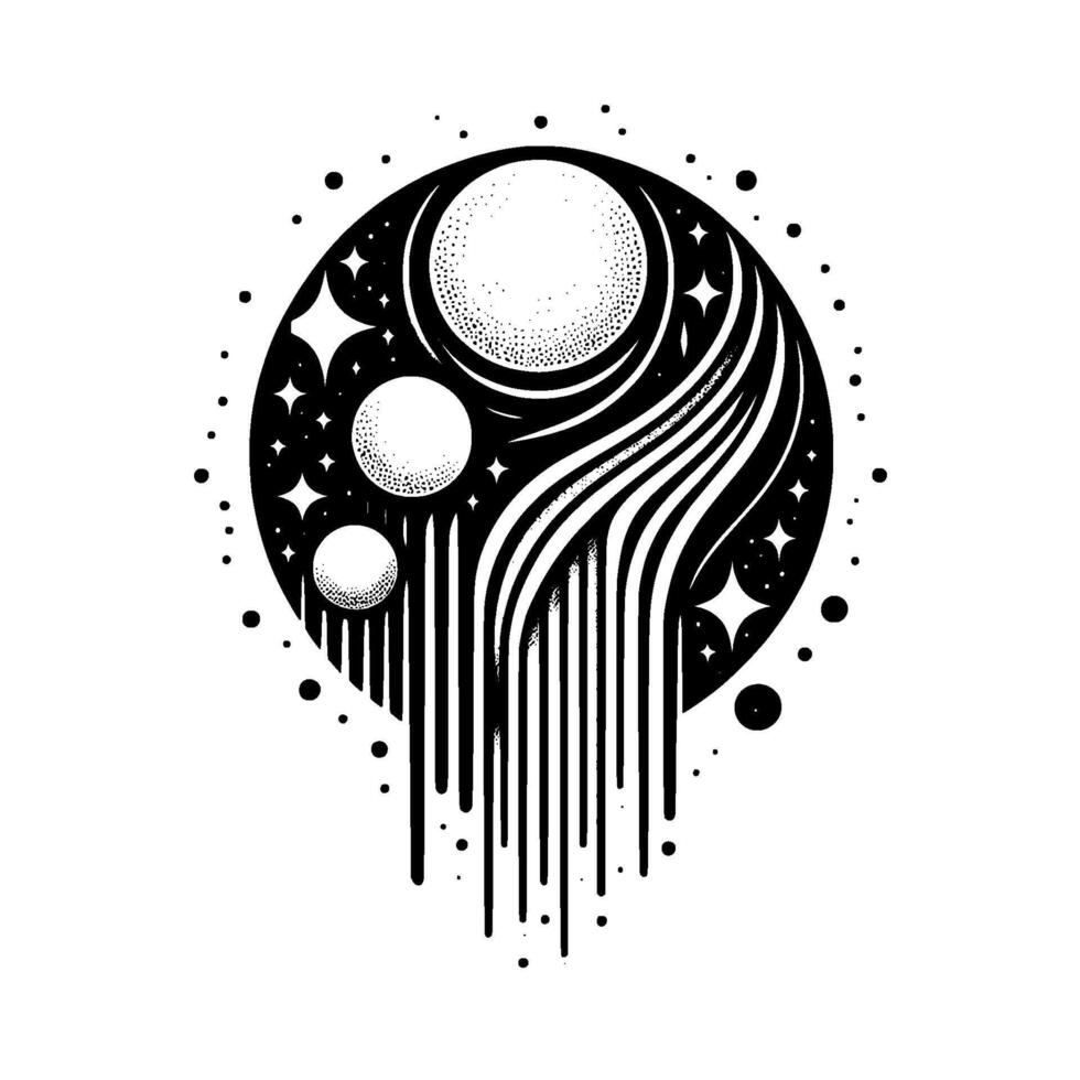 Celestial Spheres A monochrome illustration of moons and stars within a cosmic orb with abstract flowing elements. Pro Vector