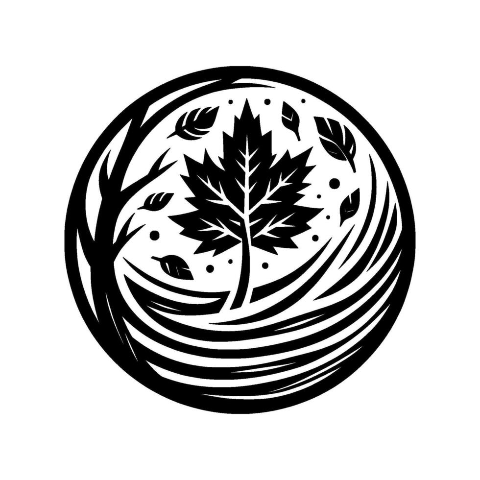 Black and white illustration depicting a stylized maple leaf and scattered leaves inside a circular frame, with organic tree branch elements. vector
