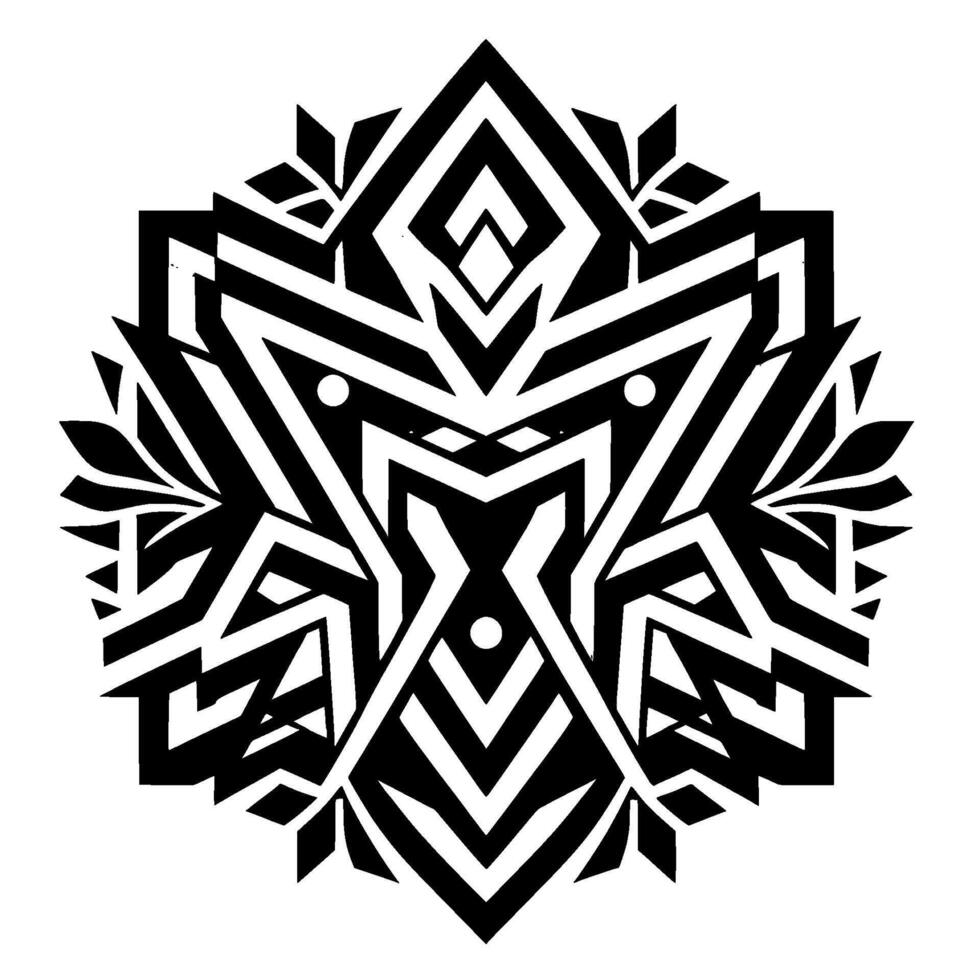 Intricate symmetrical black and white geometric with stylized patterns, sharp angles, and botanical elements, centered on a white background. vector