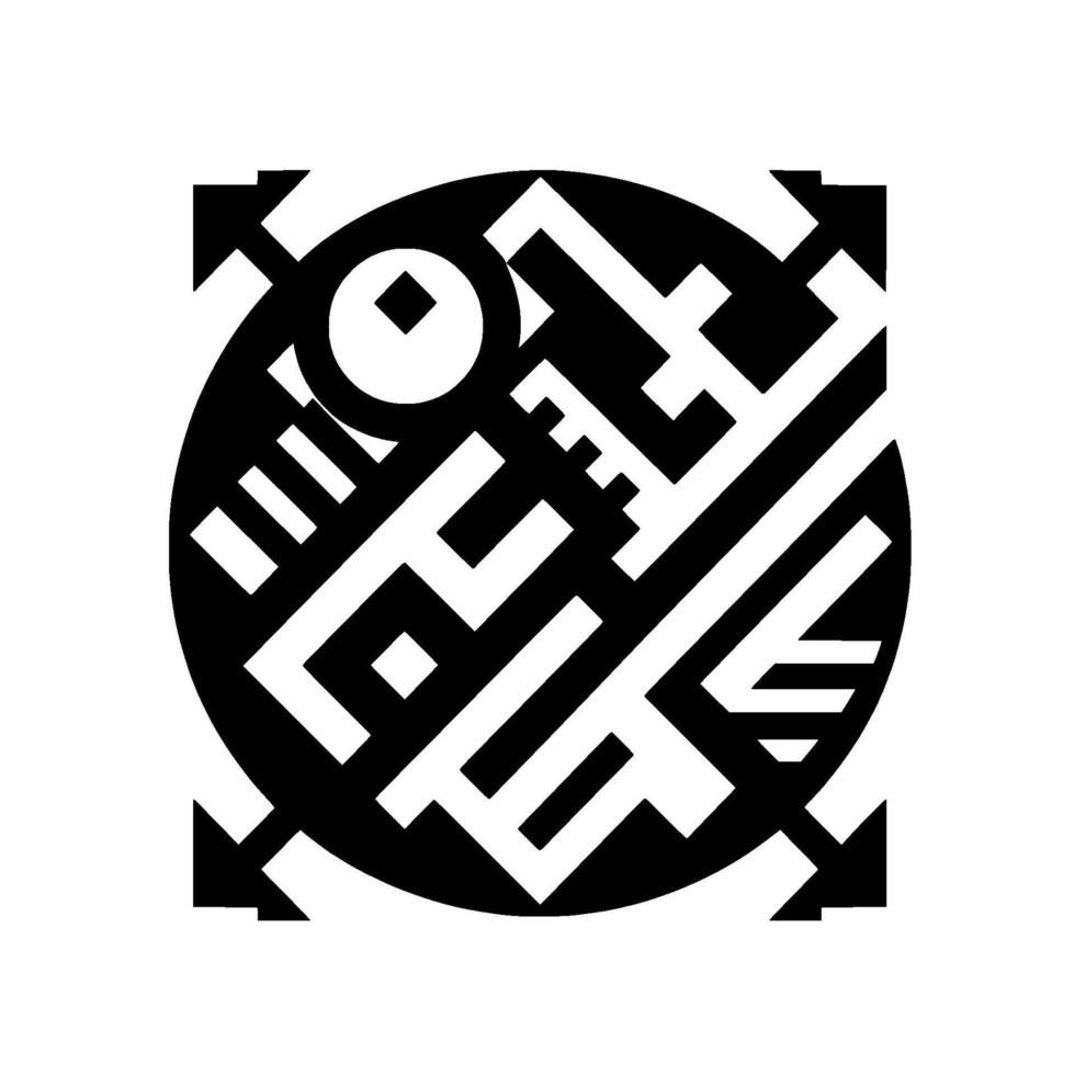 Geometric Black and White Circular Abstract Composition with Mazelike Patterns, Arrows, and Squares. vector