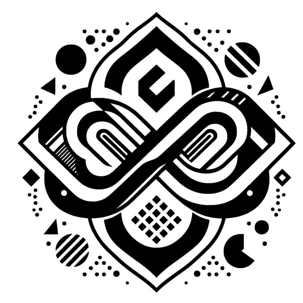Intricate Black and White Geometric Mandala A symmetrical composition of interwoven lines, stylized shapes, and dot patterns, creating a modern abstract . vector