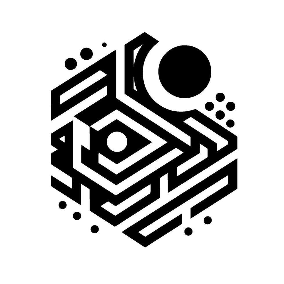 Geometric Hexagon with MazeLike Lines, Circles, and Crescent in Bold Black and White, Abstract . Free Vector