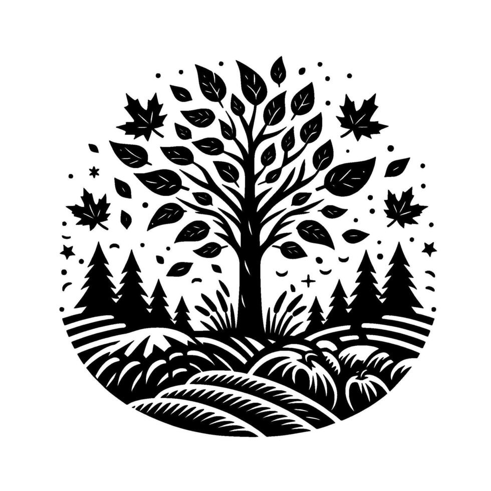 Monochromatic illustration of a tree surrounded by falling leaves, stylized fir trees, and a pumpkin patch, all contained within a circular frame. vector