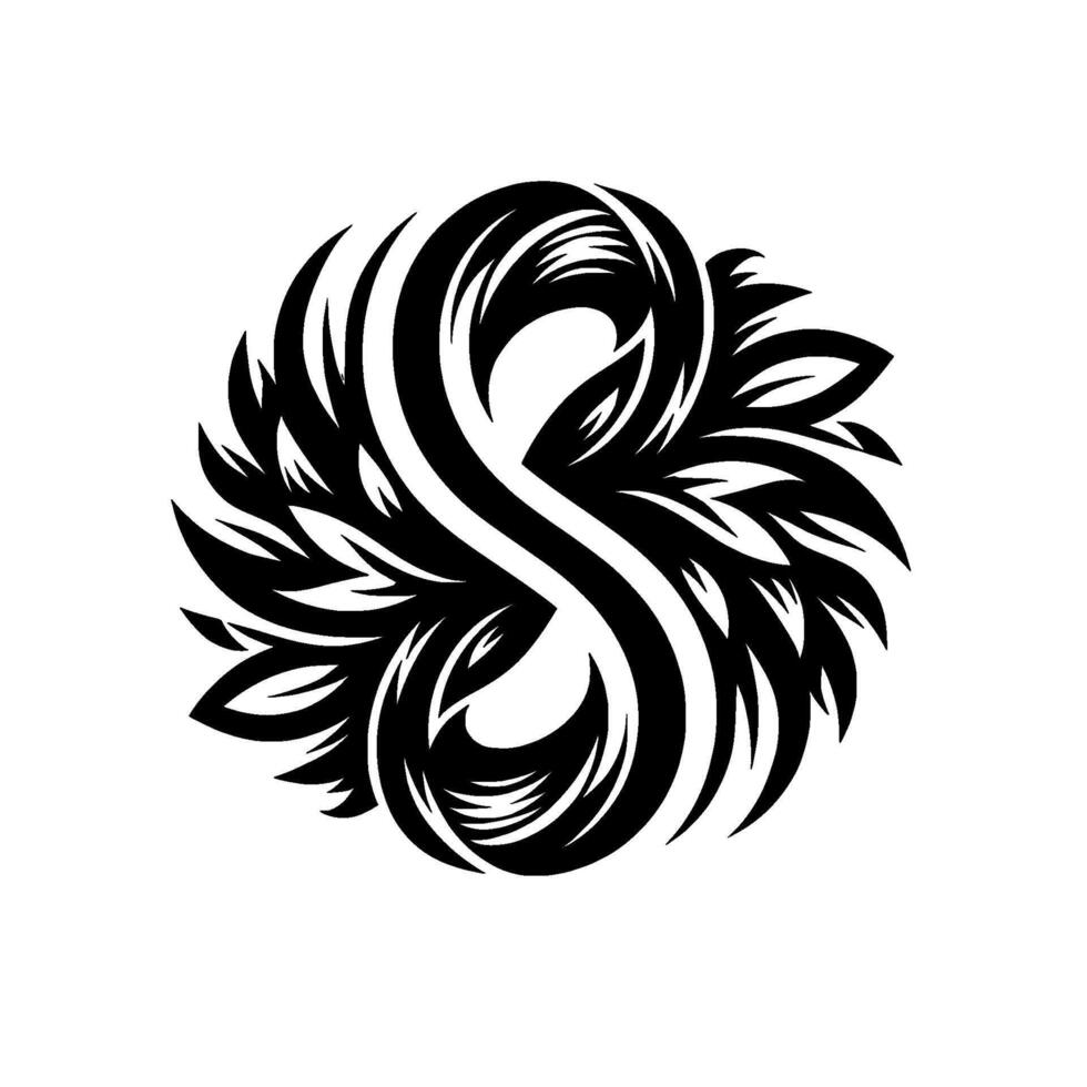 A symmetrical, black and white abstract featuring a stylized S shape, interwoven with intricate leaflike patterns, set against a plain white background. vector