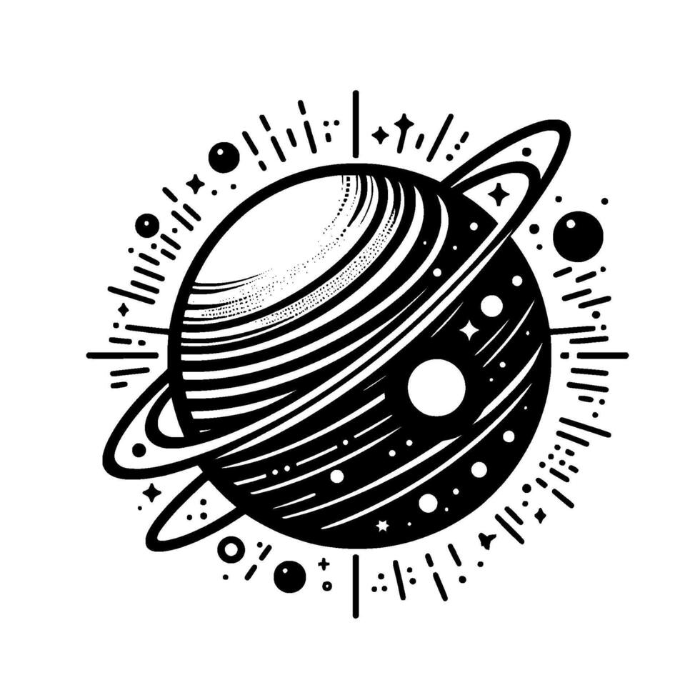 Black and white illustrative artwork featuring a stylized planet with rings surrounded by stars, dots and cosmic lines, creating a whimsical, minimalist space . vector