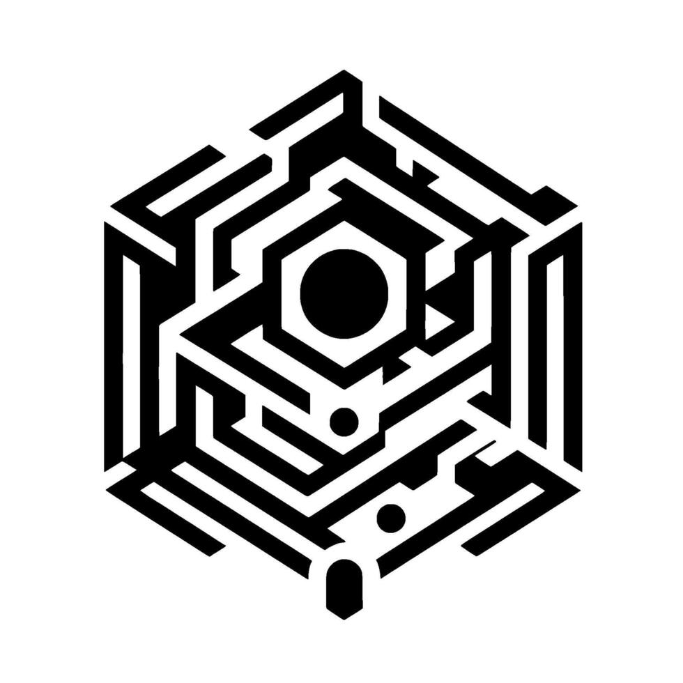 Abstract Hexagonal Maze with Black Geometric Paths, Central Dot, and Minimalist on White Background. vector